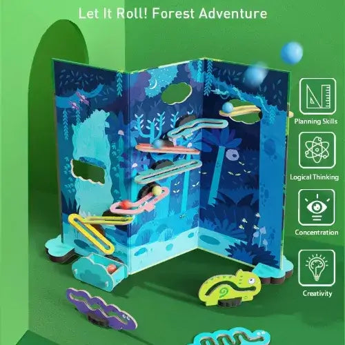 تتميز مجموعة اللعب الإبداعية هذه بمشهد غابة مرسوم بإتقان مع مسارات متعرجة حيث يمكن للأطفال تدحرج الكرات عبر مسارات وعوائق متنوعة.